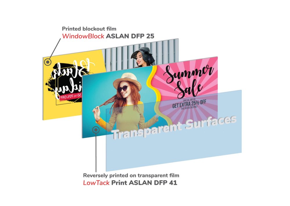 In combination with a reversely printed clear digital printing film such as Aslan DFP 41, both sides of a glass surface can be used without actually applying any film on the outside.