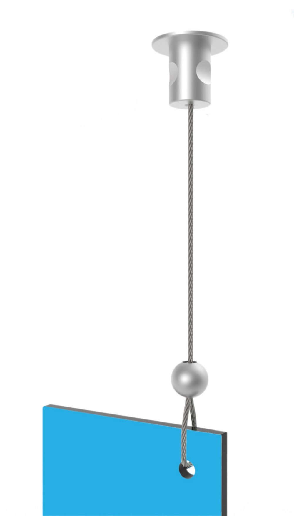 The KD Fly Lean Perla is the complete solution for ceiling signage suspension. Made from long-lasting silver matt anodised aluminium.